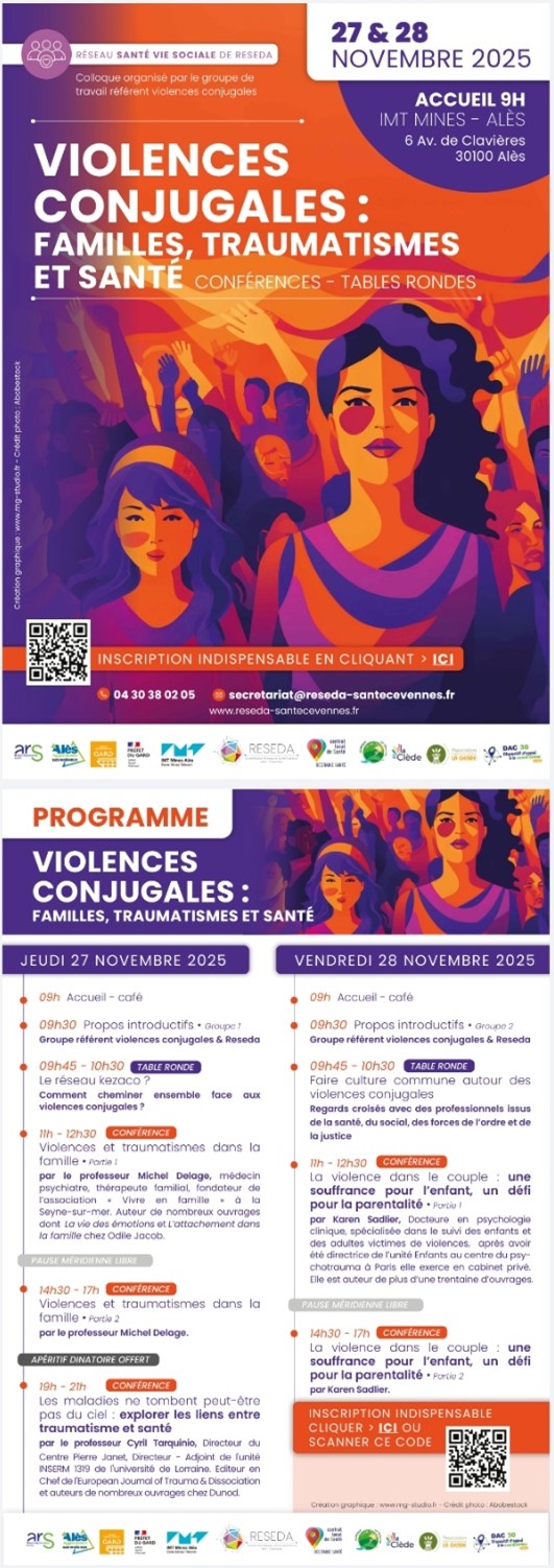 Plusieurs salariées du DAC ont récemment participé – à l’organisation et en tant que participantes, au colloque construit par le groupe de travail « violences conjugales » du réseau santé-vie sociale de l’association RESEDA les 27 et 28 novembre 2025 à Alès.